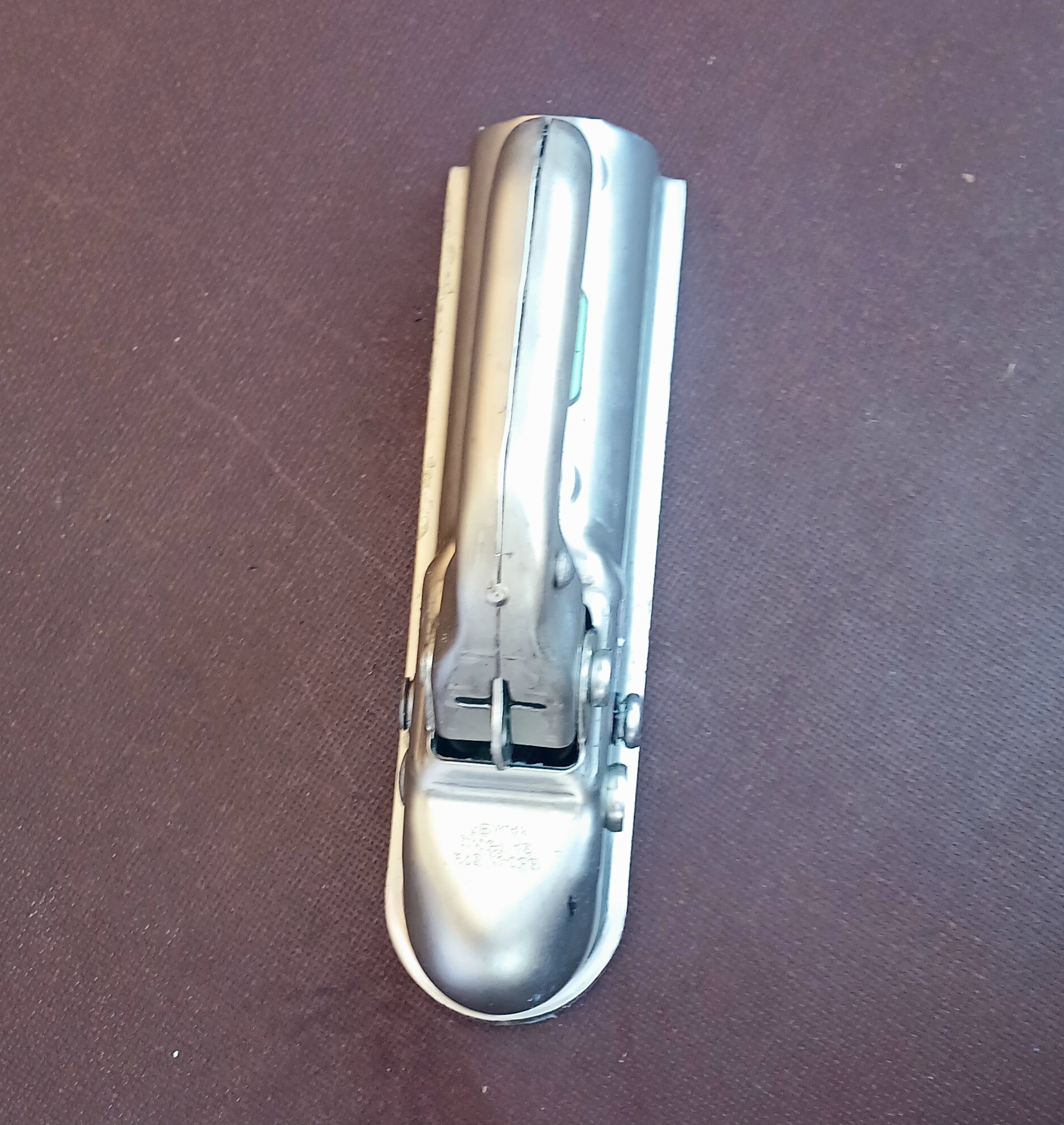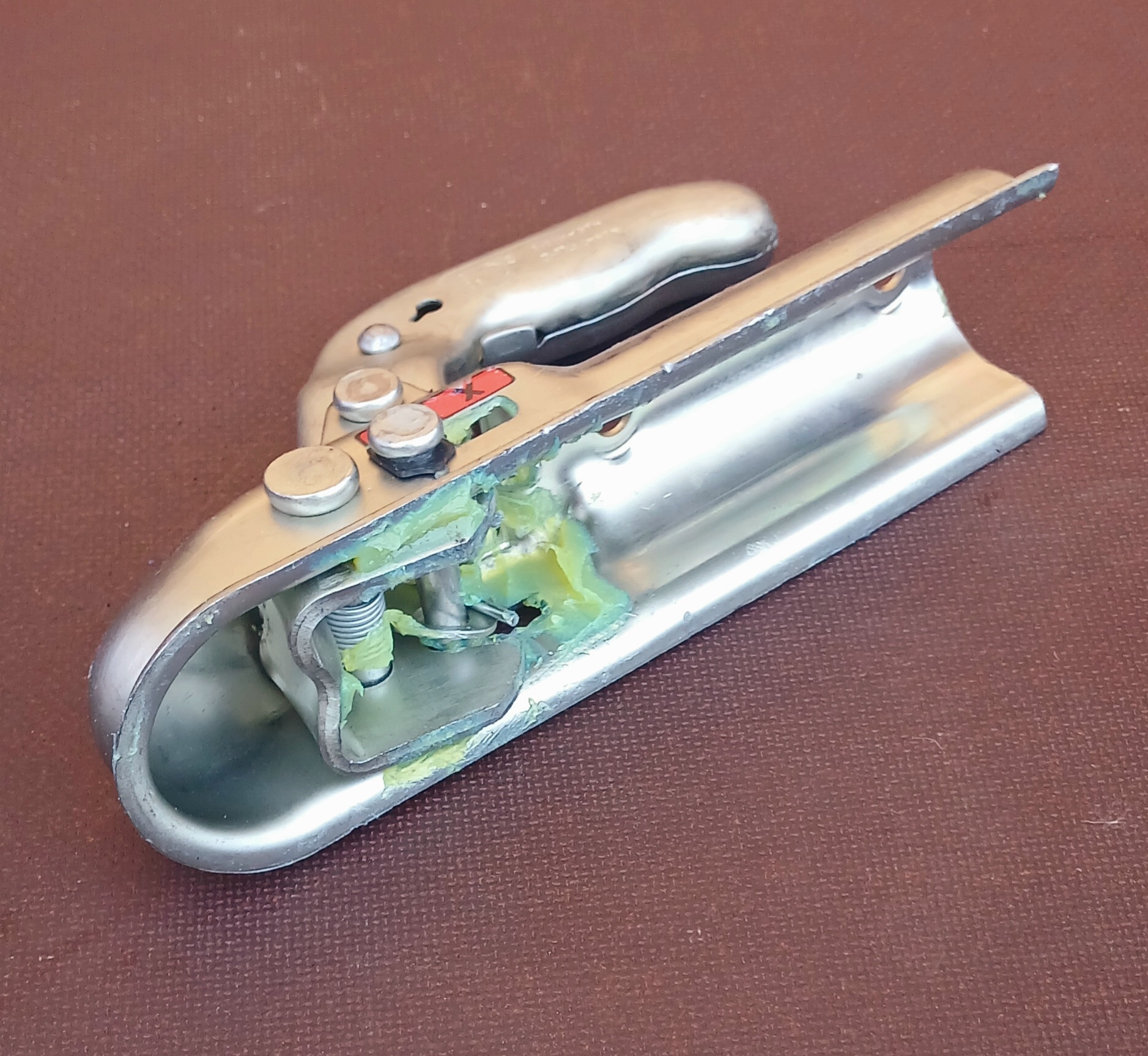 Прицепное устройство для прицепа в снятом с фаркопа состоянии имеет опущенную ручку, указатель на индикаторе сбоку указывает на минус в красном квадрате.
