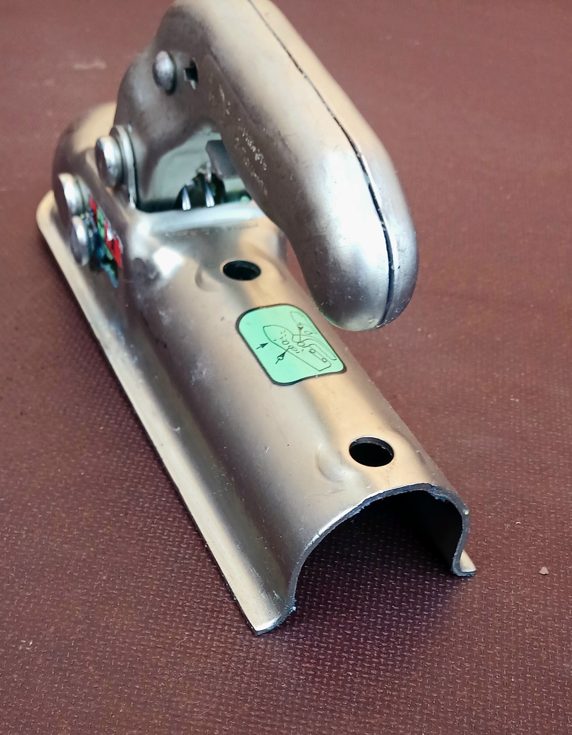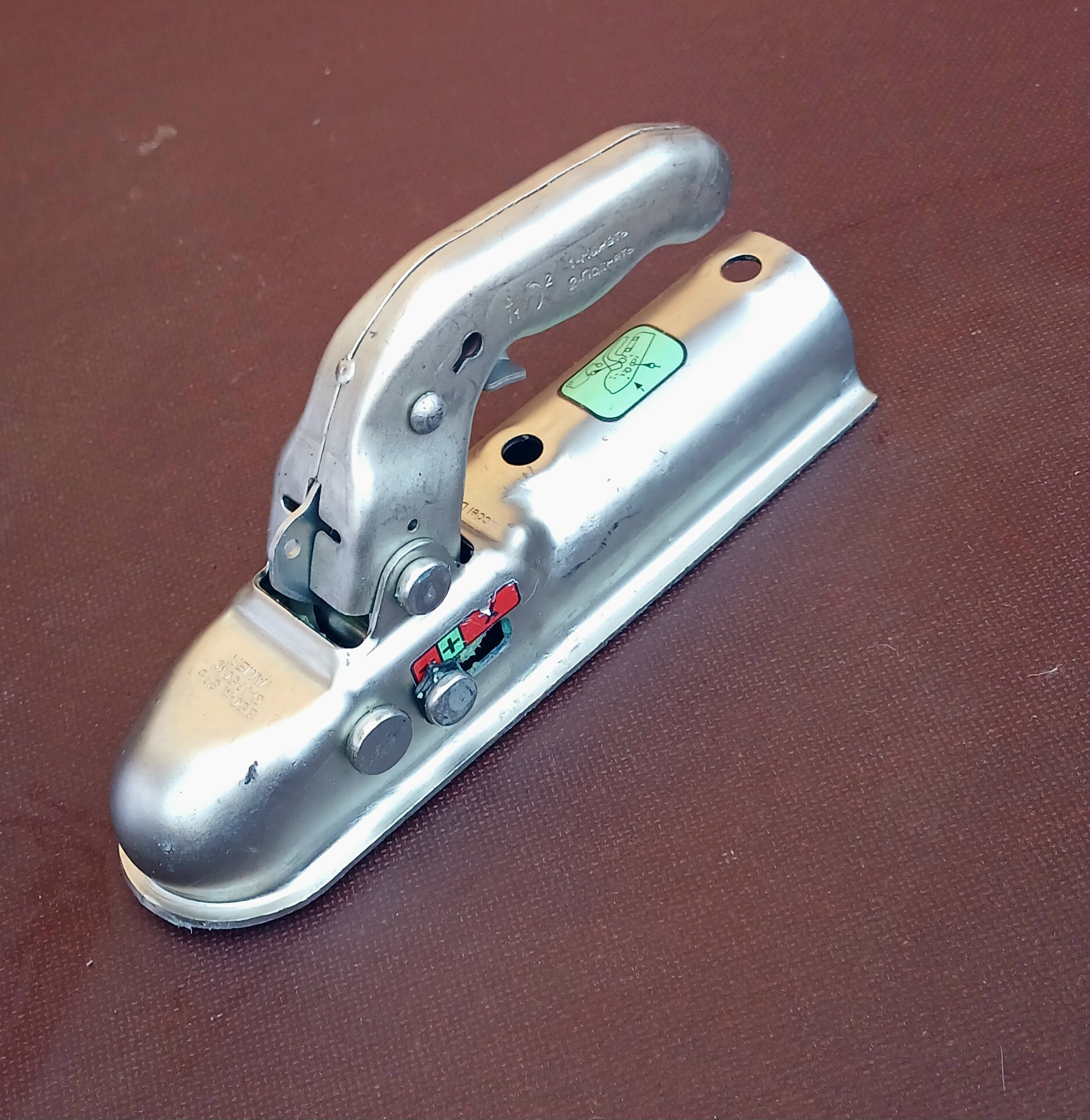 Для надевания замка для прицепа на шар крепления фаркопа необходимо поднять ручку (индикатор будет указывать на крестик в красном квадрате), надеть на фаркоп и произойдет автоматическое закрытие замка блокиратора сцепного устройства с щелчком и опусканием ручки. Индикатор перейдет в положение под плюсом в зеленом квадрате, показывая, что сцепка замкового устройства произведена.