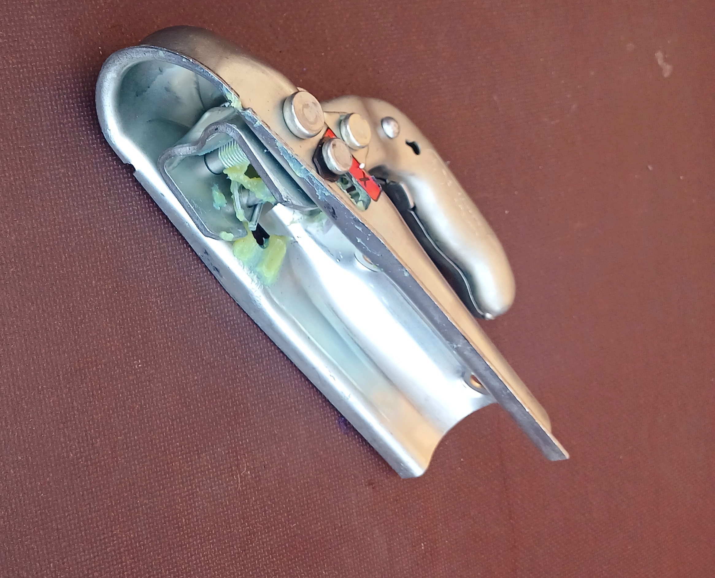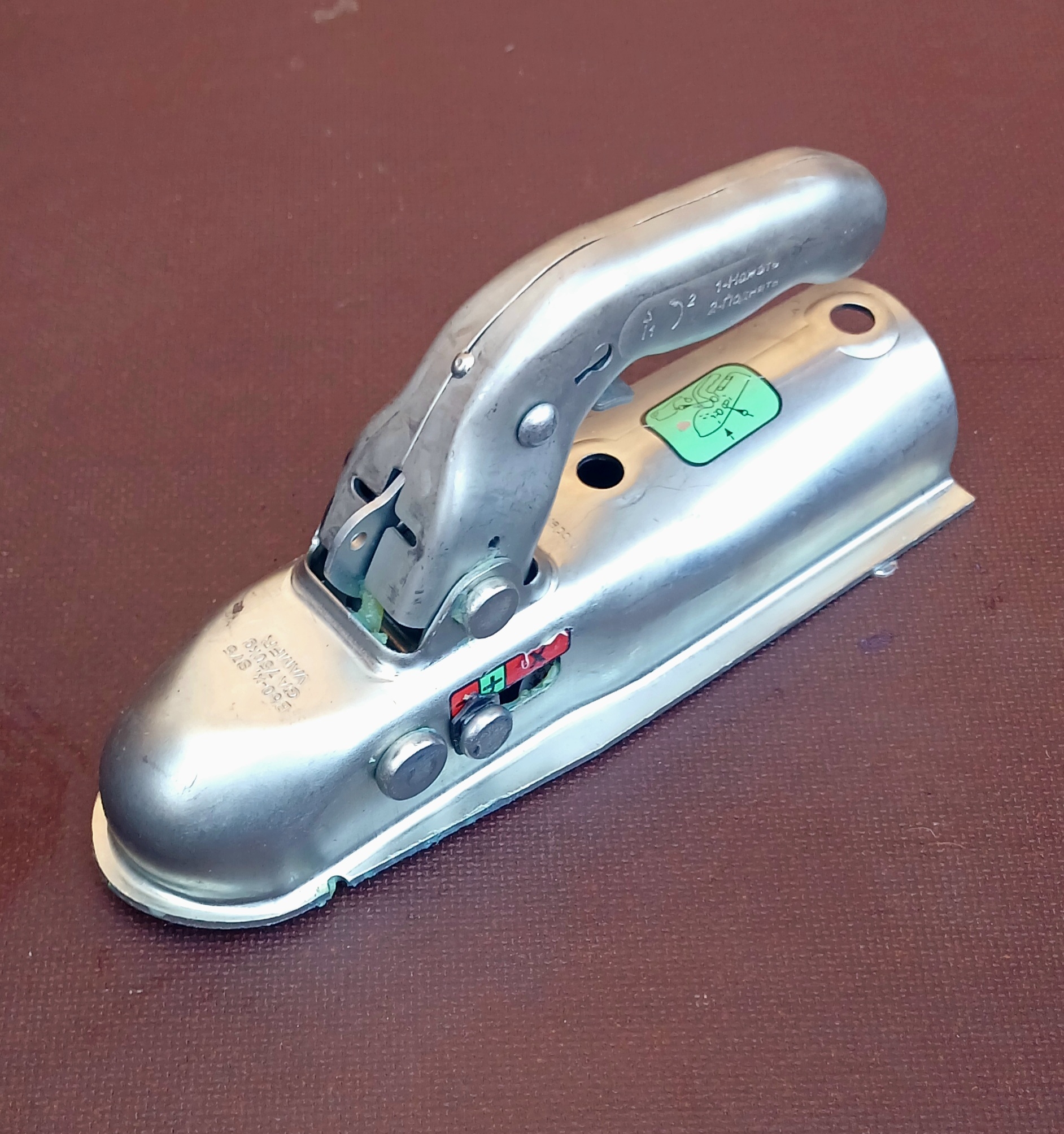 Для надевания замка для прицепа на шар крепления фаркопа необходимо поднять ручку (индикатор будет указывать на крестик в красном квадрате), надеть на фаркоп и произойдет автоматическое закрытие замка блокиратора сцепного устройства с щелчком и опусканием ручки. Индикатор перейдет в положение под плюсом в зеленом квадрате, показывая, что сцепка замкового устройства произведена.