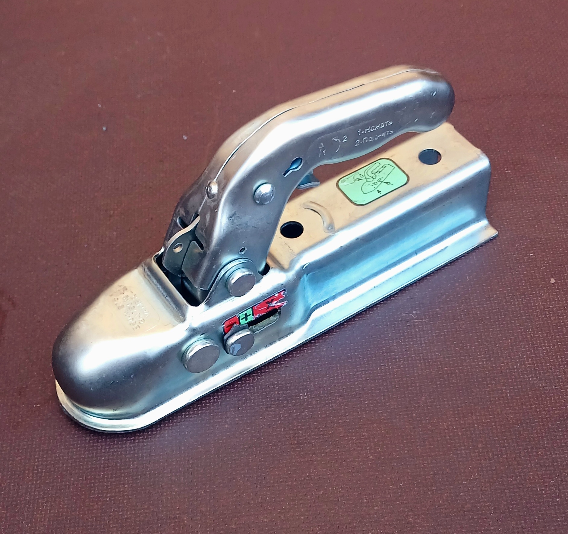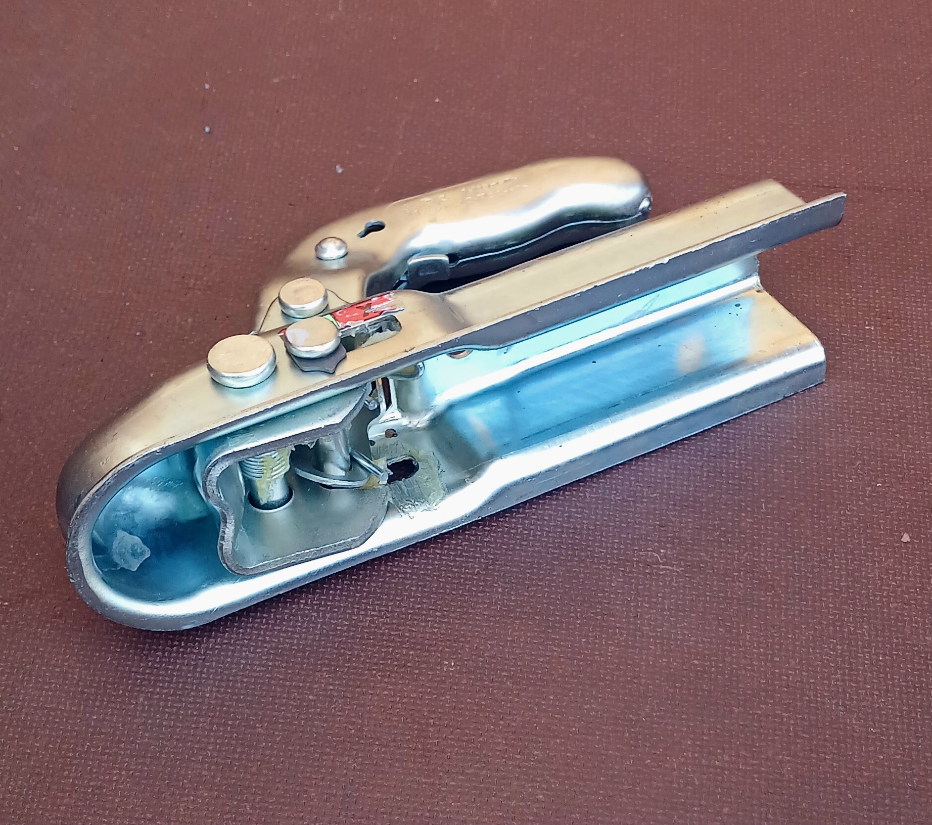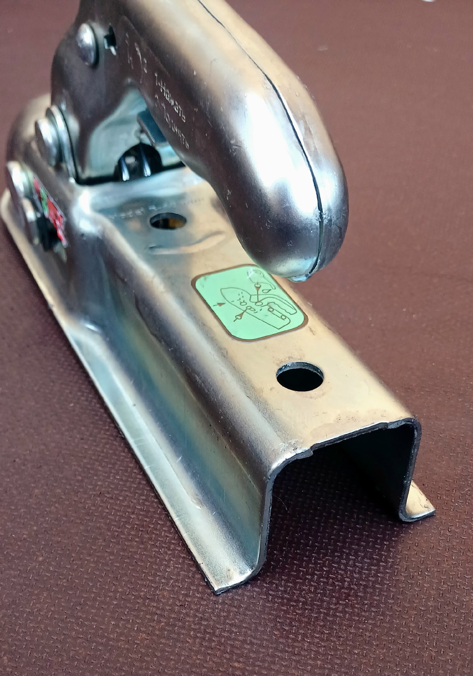 Для надевания замка для прицепа на шар крепления фаркопа необходимо поднять ручку (индикатор будет указывать на крестик в красном квадрате), надеть на фаркоп и произойдет автоматическое закрытие замка блокиратора сцепного устройства с щелчком и опусканием ручки. Индикатор перейдет в положение под плюсом в зеленом квадрате, показывая, что сцепка замкового устройства произведена.